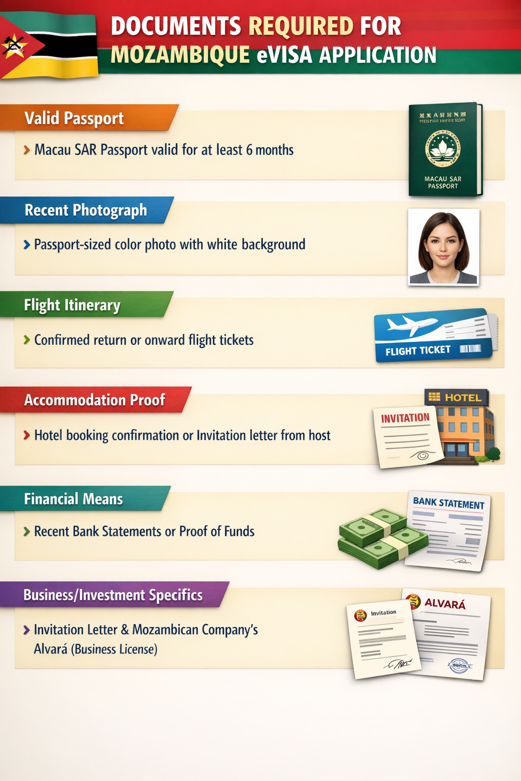 Business/Investment Specifics: For business or investment visas, you will need a formal invitation letter from the Mozambican entity and their commercial license (Alvará).