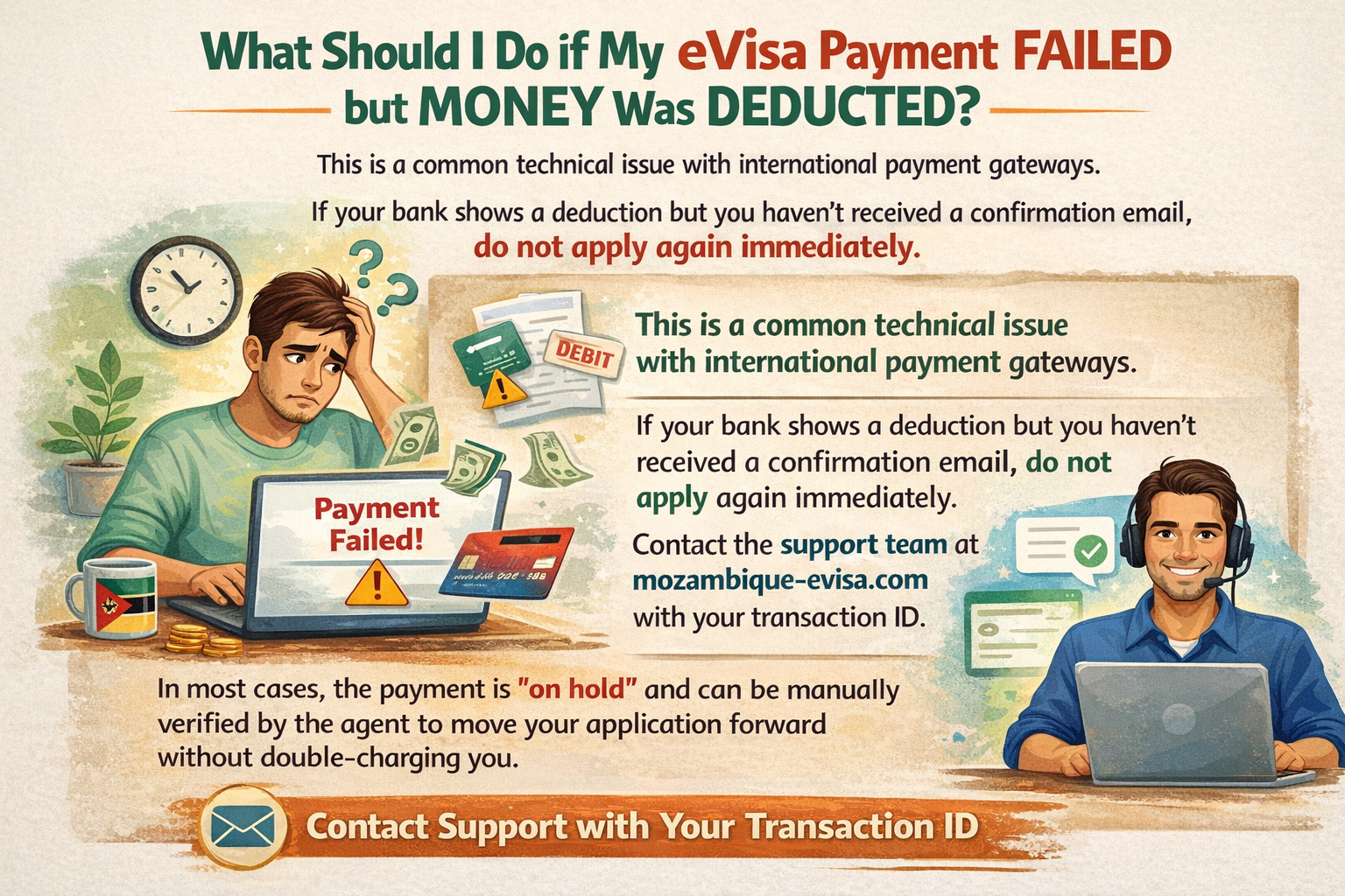 This is a common technical issue with international payment gateways. If your bank shows a deduction but you haven't received a confirmation email, do not apply again immediately. Contact the support team at mozambique-evisa.com with your transaction ID. In most cases, the payment is "on hold" and can be manually verified by the agent to move your application forward without double-charging you.